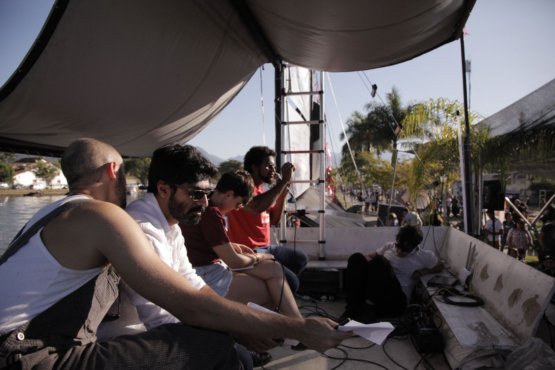 Asad Haider, Débora Baldin e Jones Manoel na FLIPEI 2019, em Paraty (RJ). Foto: Luiza Queiroz.